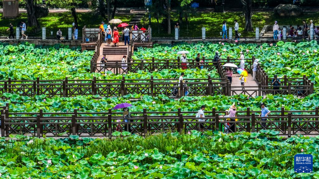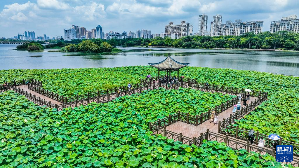 6月10日,游人在南宁市南湖之滨荷花池参观游览(无人机照片)。