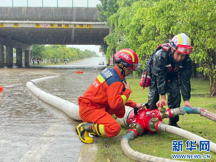 7月18日,在广西钦州市钦南区,消防员正在利用城市排涝车对受涝桥洞进行排涝。(钦州市消防救援支队供图)