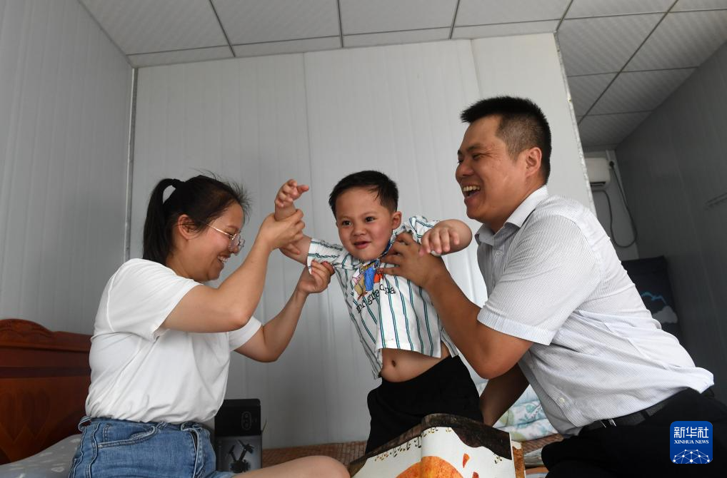 7月26日,在广西上横高速公路建设工地职工宿舍活动板房里,来自广西来宾市的韦靖楷和爸爸妈妈一起玩耍。