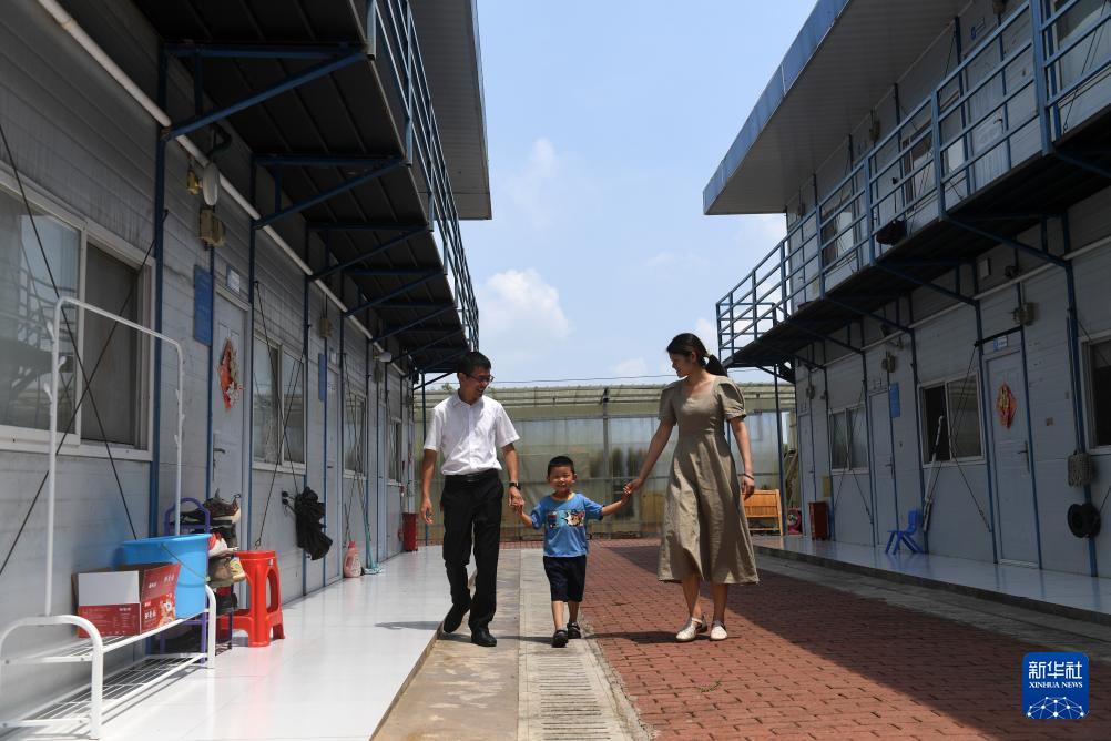 7月26日,在广西上横高速公路建设工地职工宿舍区,来自湖北省麻城市的刘宇灿和爸爸妈妈从活动板房前走过。