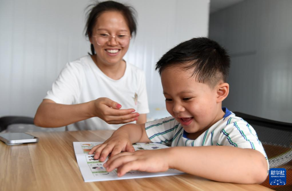 7月26日,在广西上横高速公路建设工地职工宿舍活动板房里,来自广西来宾市的韦靖楷在妈妈的指导下看图识字。