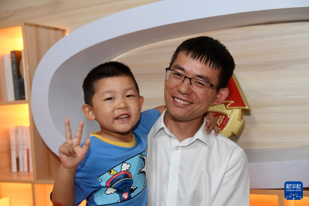 7月26日,在广西上横高速公路建设项目部,来自湖北省麻城市的刘宇灿和爸爸在一起。