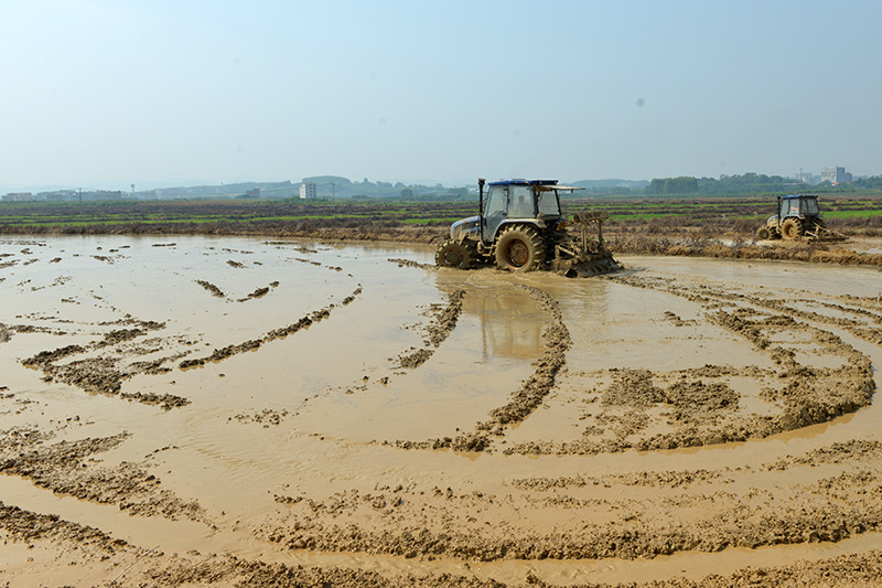 七月盛夏,骄阳似火,在南宁市西乡塘区双定镇英龙村的700亩杂交水稻制种基地,拖拉机在水田里来回耘耙,村民们忙着插秧。