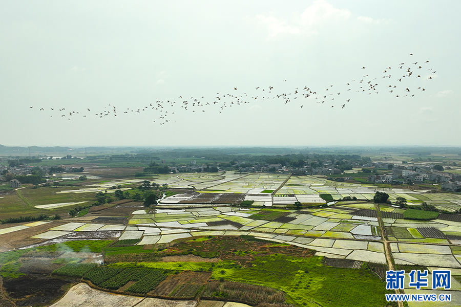 成群白鹭在田间飞翔。(罗桂源 摄)