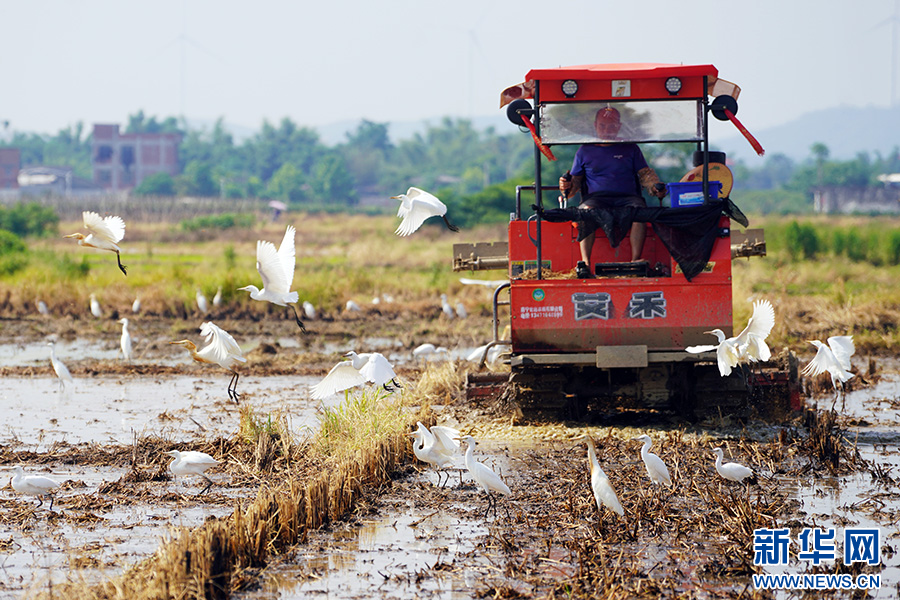 成群白鹭陪伴“铁牛”在田间劳作。(潘虹岑 摄)