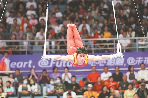 9月24日,杭州亚运会进入开幕后的首个比赛日,广西健儿的首金就来了:在竞技体操男子团体决赛中,柳州仔兰星宇携手队友努力拼搏,最终,中国队实现卫冕,兰星宇也拿到自己的第一枚亚运会金牌。图为兰星宇在吊环项目比赛中。记者 金翔义/摄