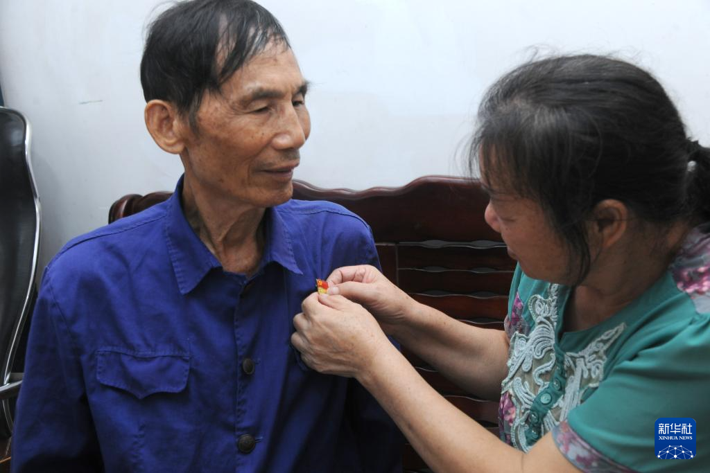 10月2日,梁乐的爱人帮他戴上党徽。