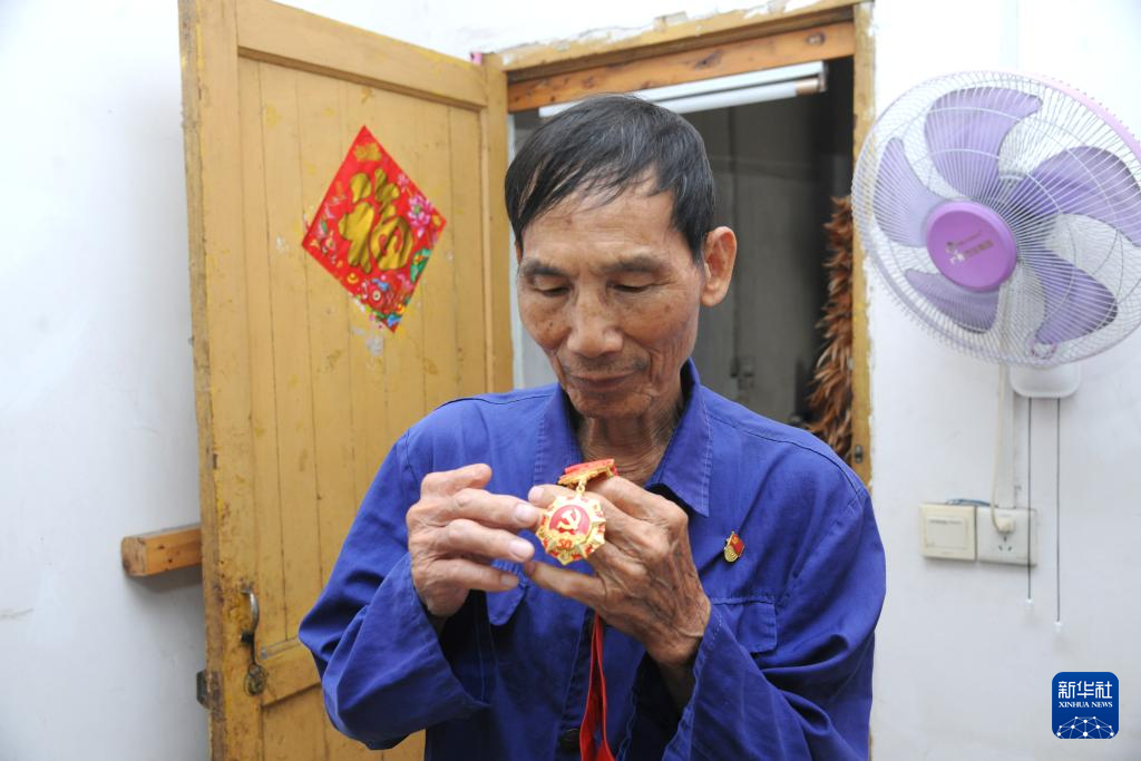 10月2日,梁乐在家中查看“在党50年徽章”。