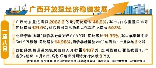 一年来,广西发挥“一湾相挽十一国,良性互动东中西”的独特区位优势,服务和融入全国统一大市场建设,以东盟为重点,深度融入共建“一带一路”,在扩大对内对外开放中强动力、增活力,打开发展新天地。