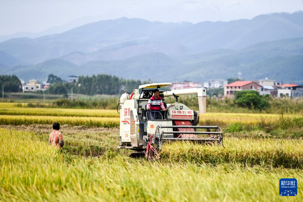 10月24日,在广西贵港市港北区大圩镇,农机手在收割水稻。