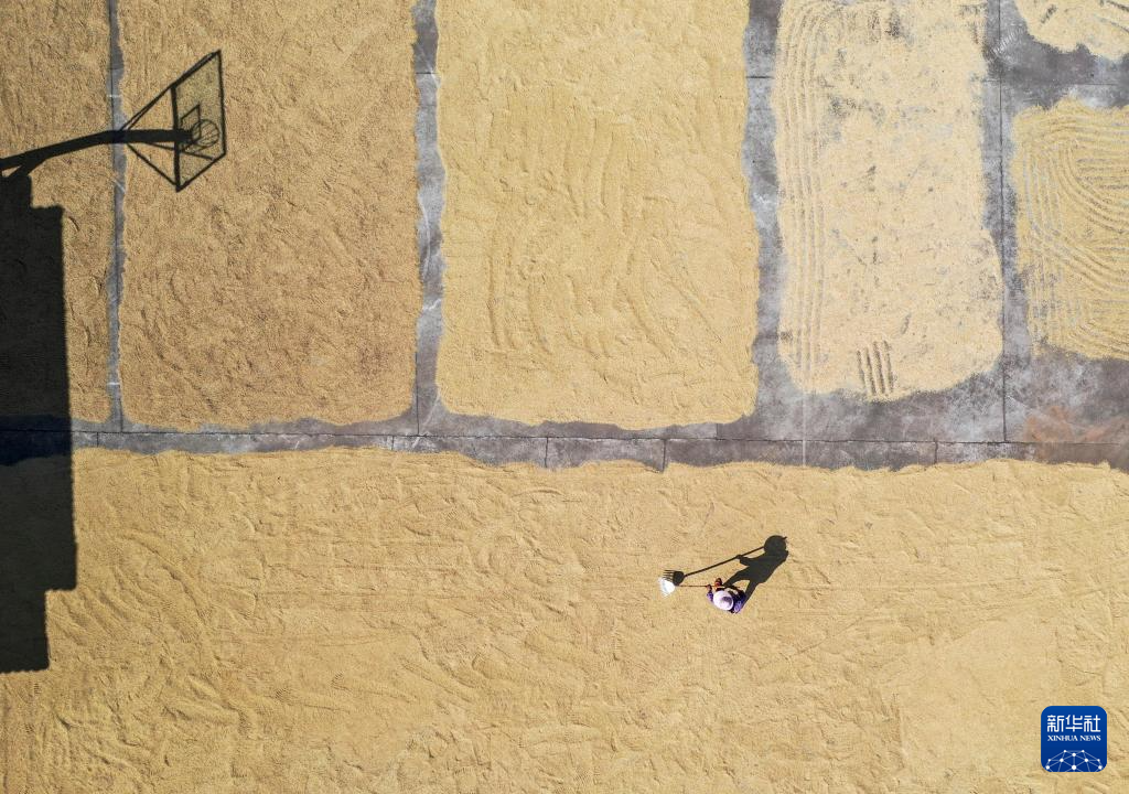 10月24日,广西贵港市港北区大圩镇村民在晾晒稻谷(无人机照片)。