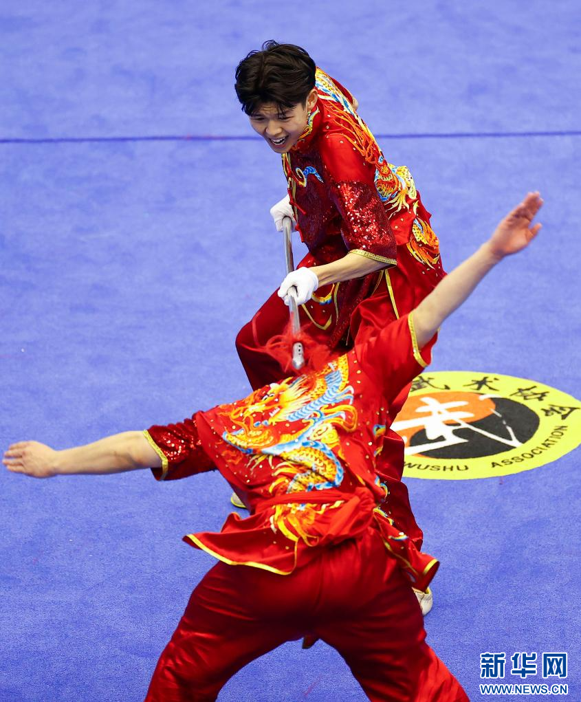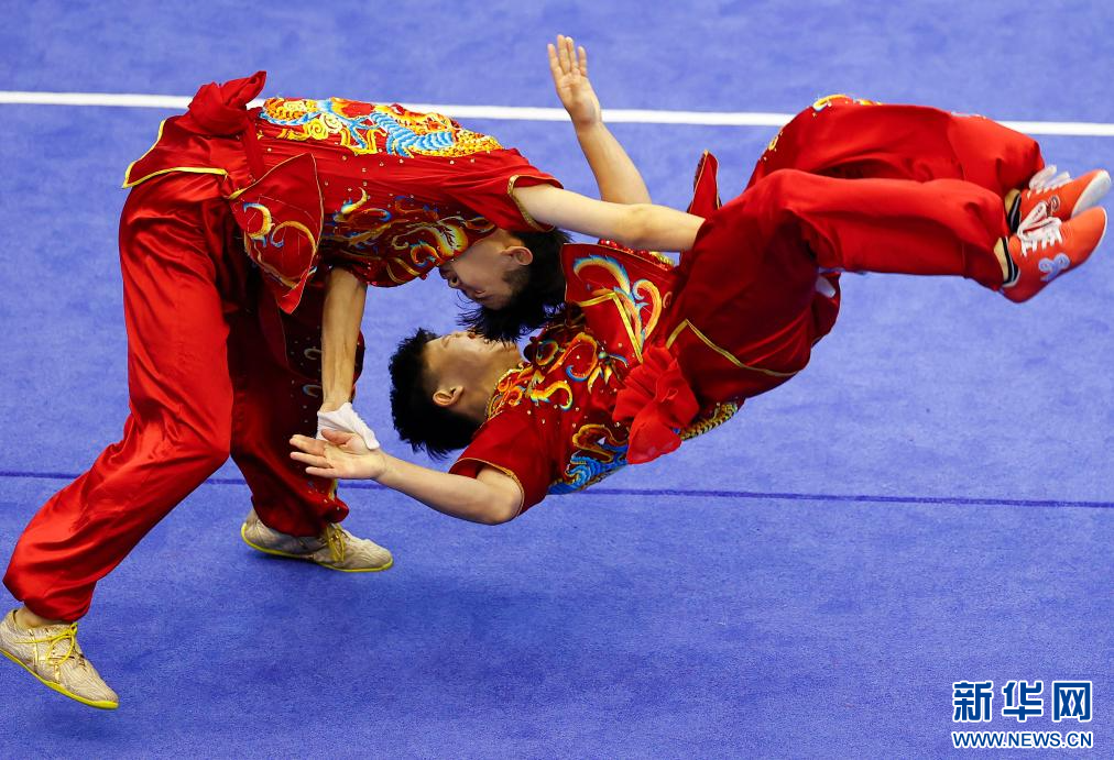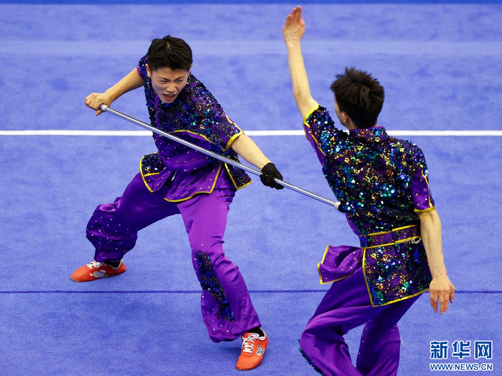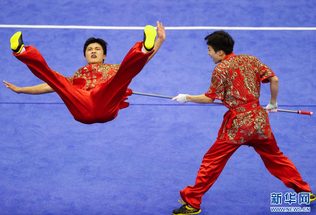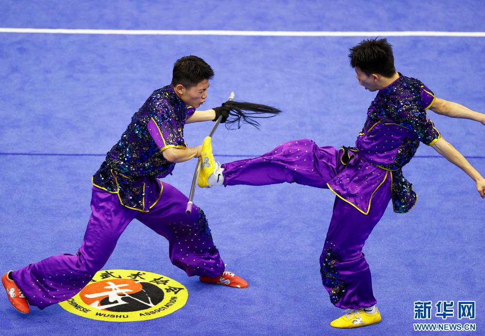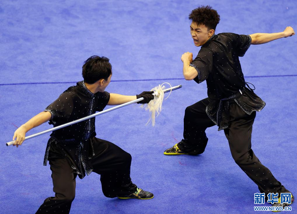 当日,第一届全国学生(青年)运动会武术套路中学组男子对练决赛在广西壮族自治区体育馆举行。