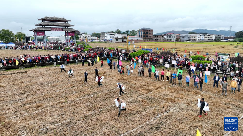 11月11日,在广西柳州市柳城县古砦仫佬族乡的稻田里,人们参加挑粮接力赛。