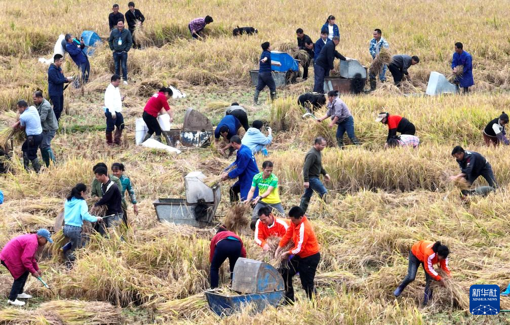 11月11日,在广西柳州市柳城县古砦仫佬族乡的稻田里,人们参加稻谷收割比赛(无人机照片)。
