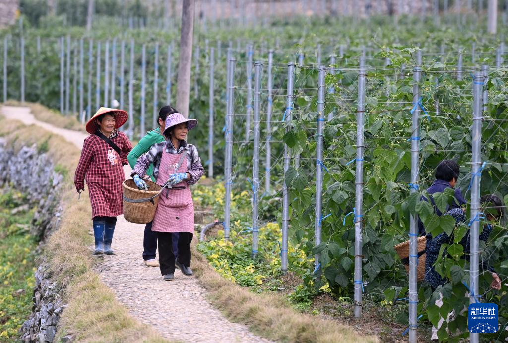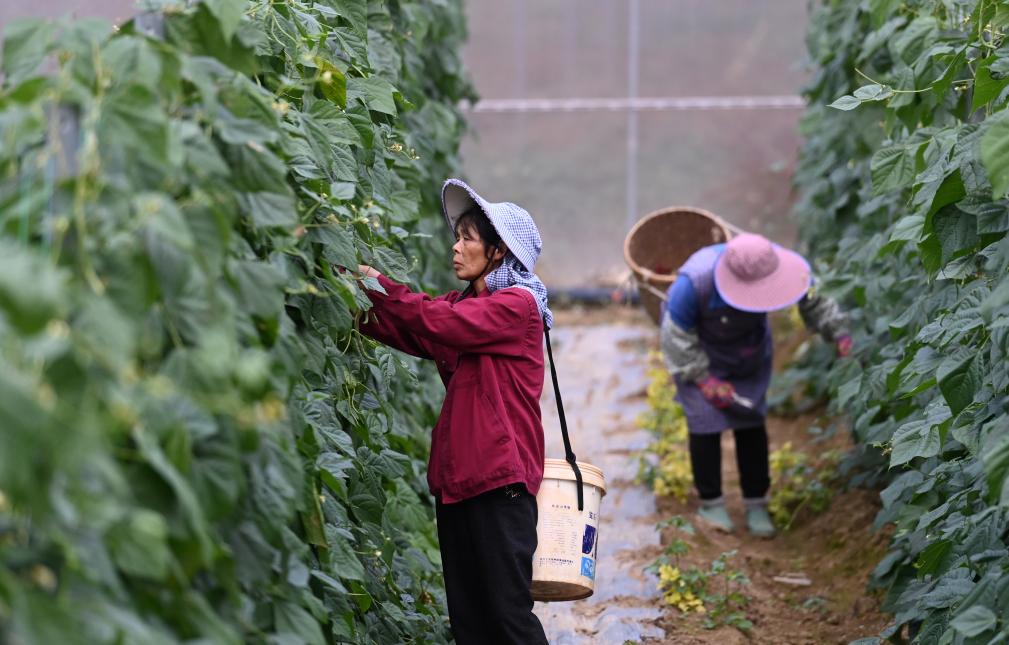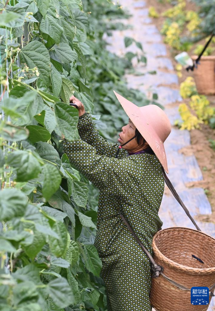 11月23日,在广西河池市大化瑶族自治县古河乡丹桂村蔬菜种植示范基地,当地村民在采摘肉豆角。