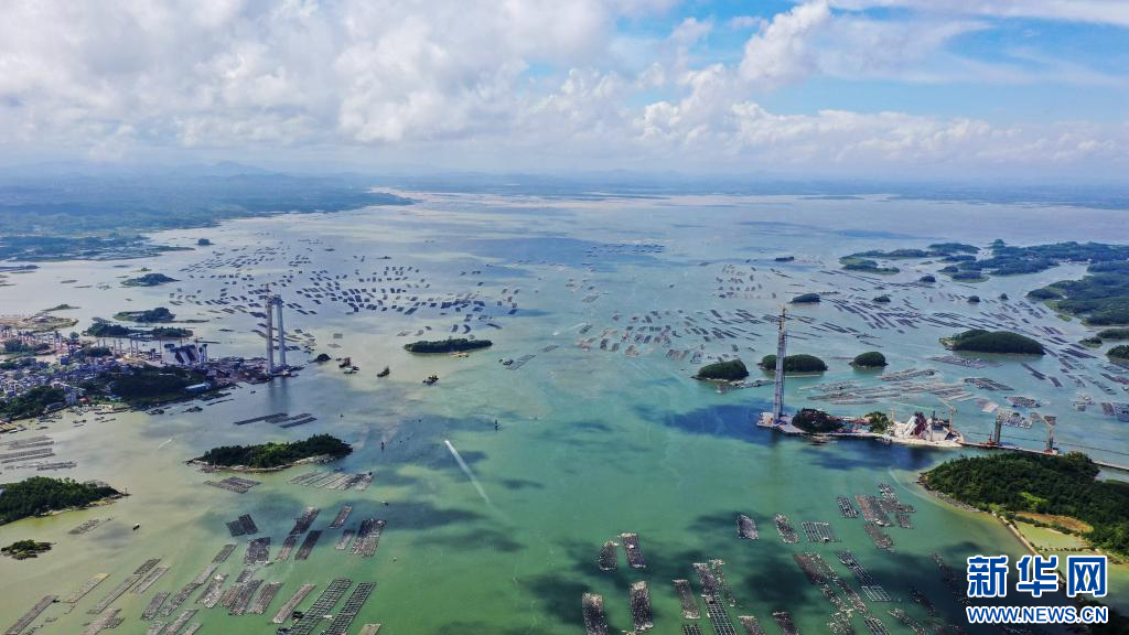 这是2022年8月27日在平陆运河出海口附近拍摄的茅尾海龙门大桥段水域(无人机照片)。