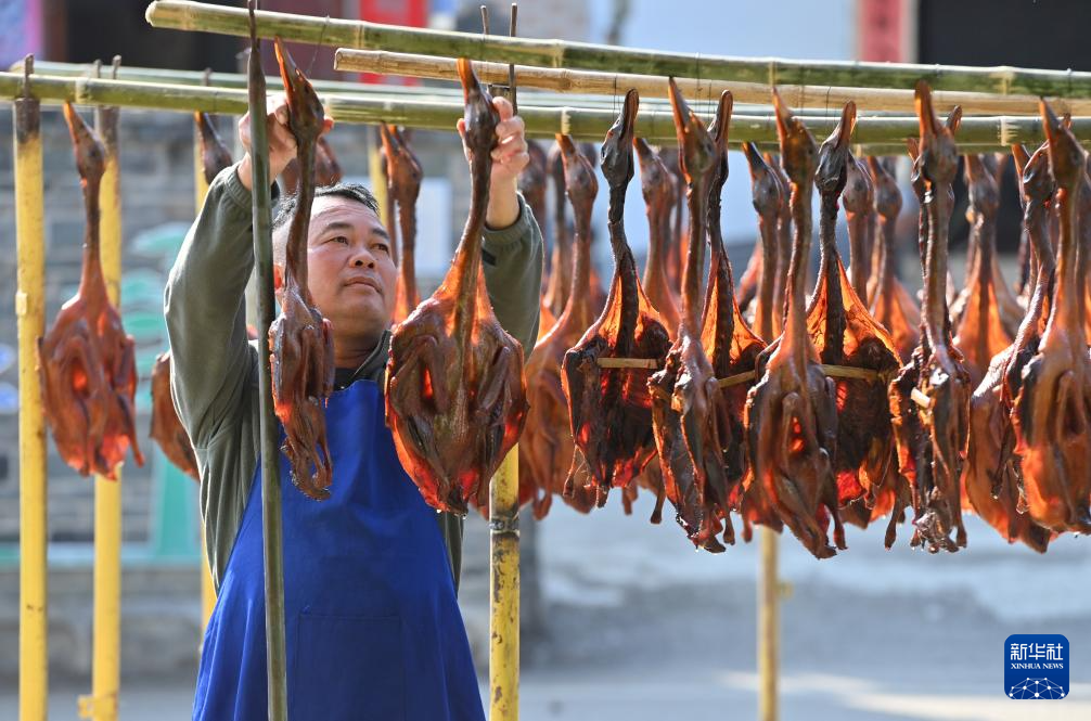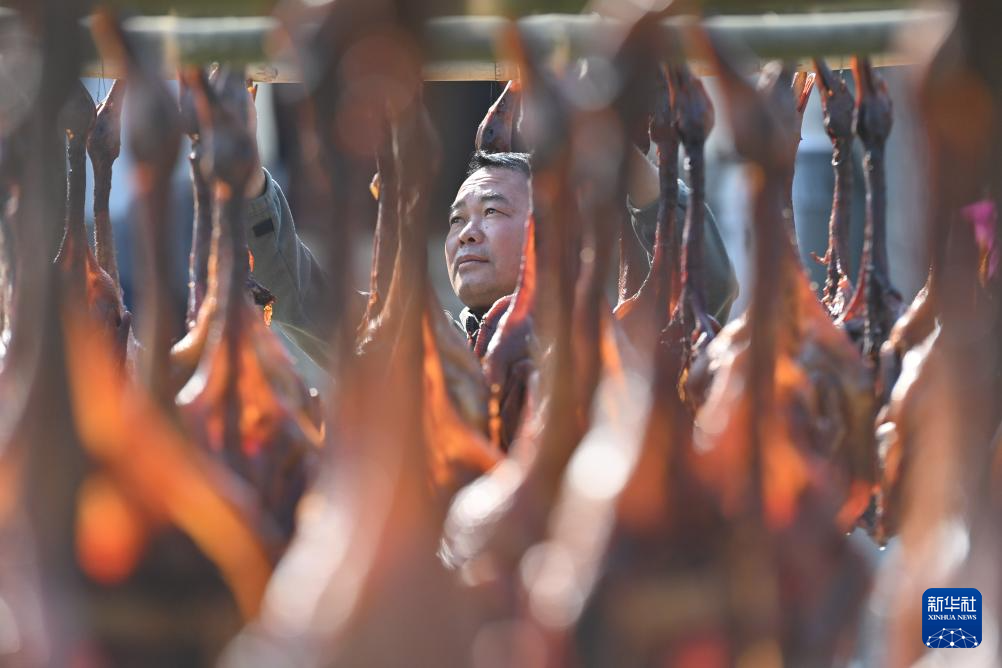 12月26日,在广西鹿寨县中渡镇马安村,村民在悬挂晾晒腊板鸭。
