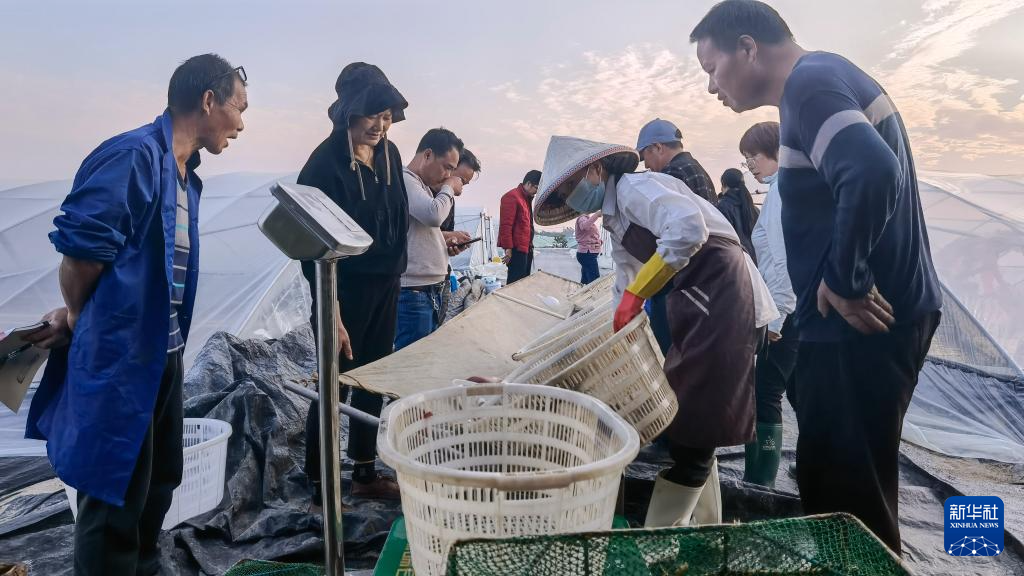 商家在合浦县廉州镇的对虾养殖基地收购对虾(12月27日摄)。