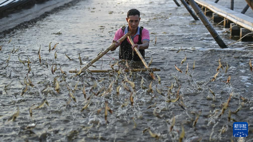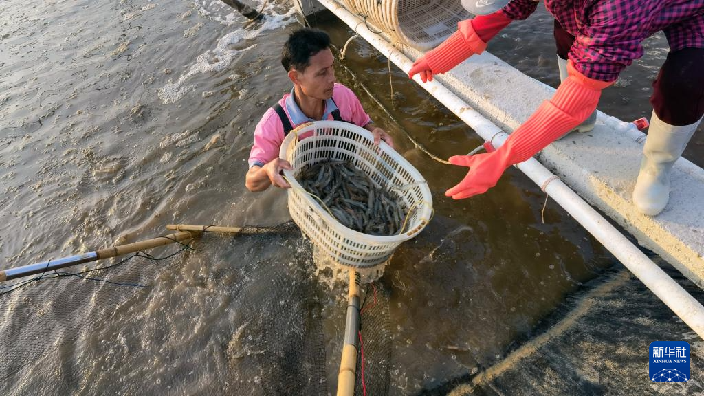 在合浦县廉州镇的一家对虾养殖场,当地村民在捕捞对虾(12月27日摄)。