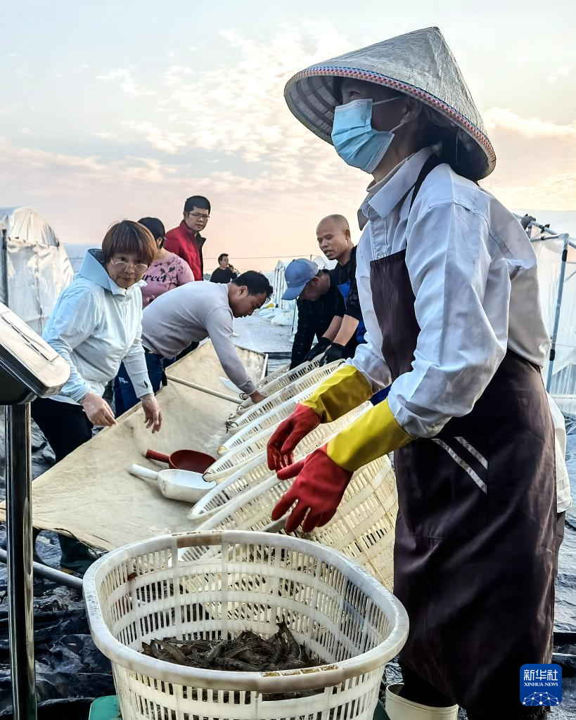 在合浦县廉州镇,当地村民在捕捞对虾(12月27日摄)。