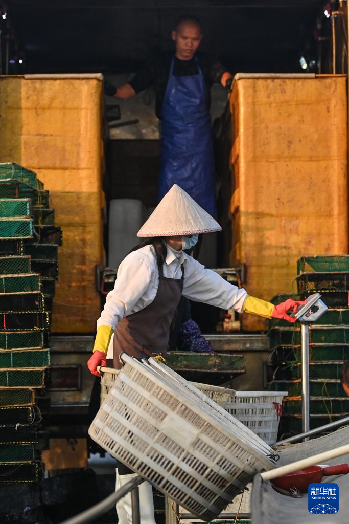 在合浦县廉州镇,村民在向商家出售对虾(12月27日摄)。