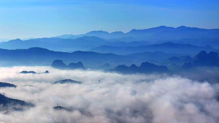 云海翻滚,山峰若隐若现,犹如一幅层次分明的水墨画。梁辉 摄