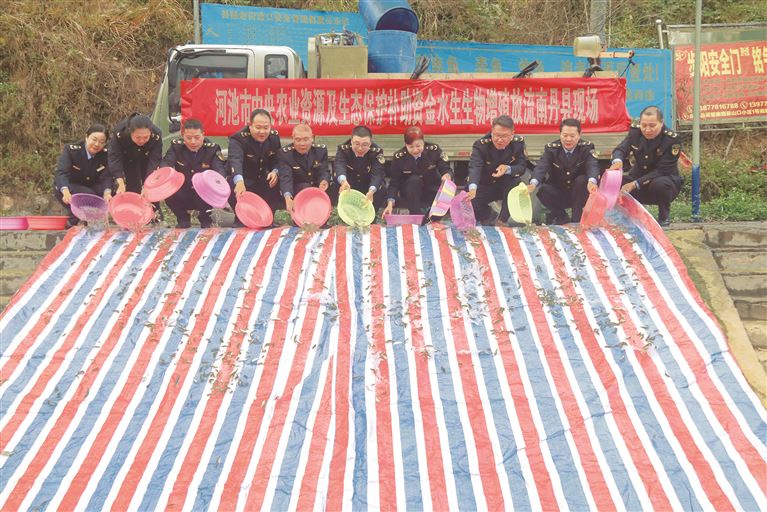 1月11日,南丹县农业农村局在该县吾隘镇红水河码头开展增殖放流活动。当天,共计投放青鱼、赤眼鳟、倒刺鲃、光倒刺鲃等鱼类18万尾。30日内,禁止在增殖放流区域进行捕捞作业。