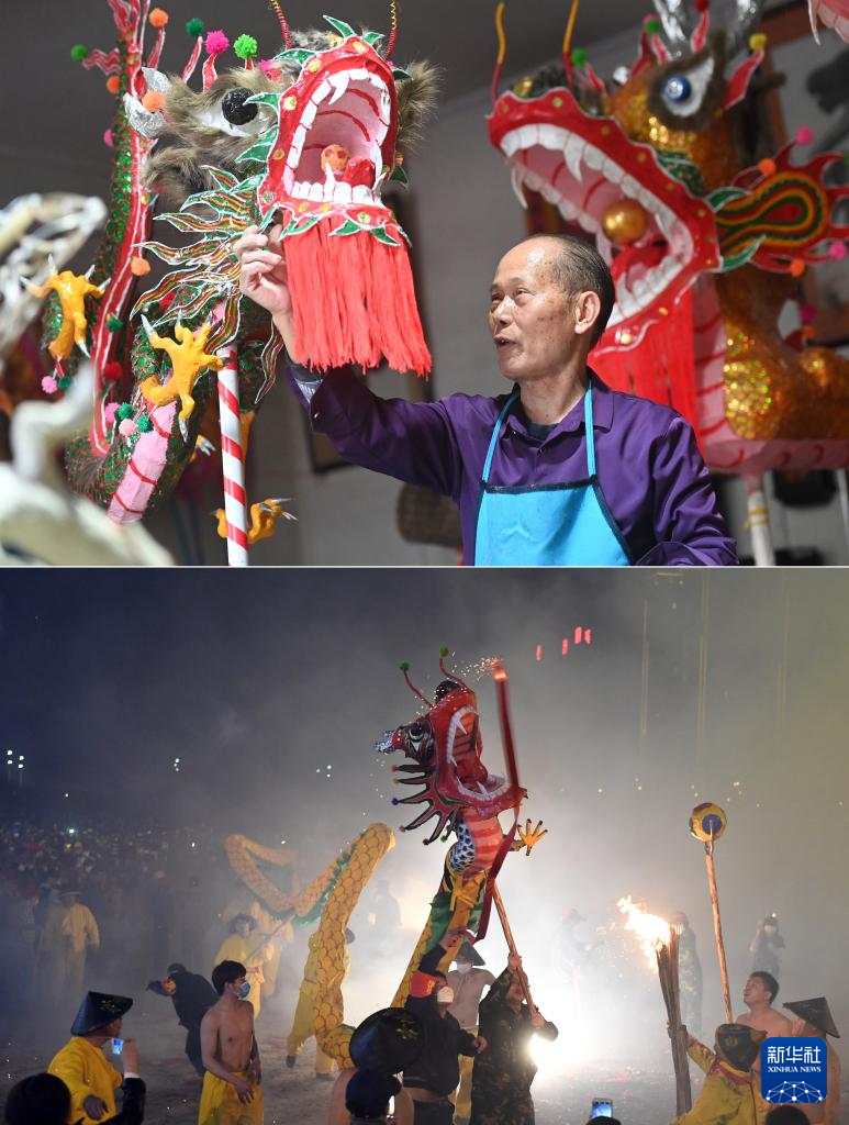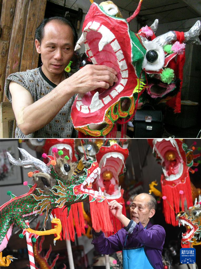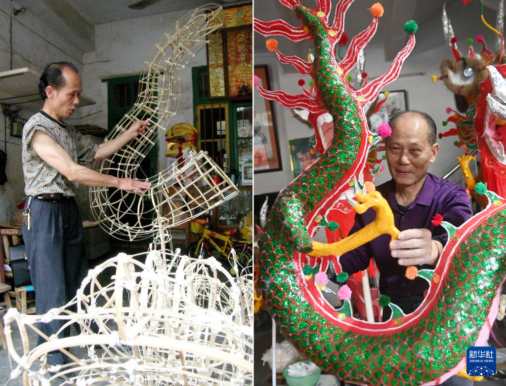 拼版照片:上图为在广西宾阳县宾州镇三联街,邹玉特在扎制炮龙(2024年1月16日摄);下图为在广西宾阳县宾州镇,人们在宾阳炮龙节上舞炮龙(2017年2月7日摄)。