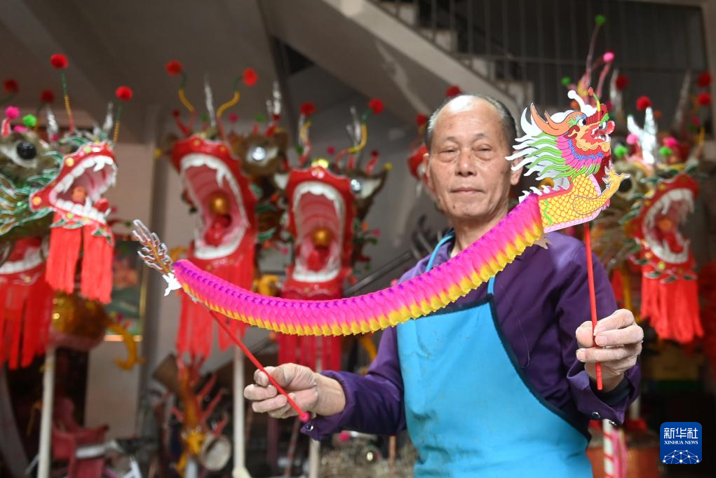1月16日,在广西宾阳县宾州镇三联街,邹玉特在展示自己制作的一款玩具炮龙。