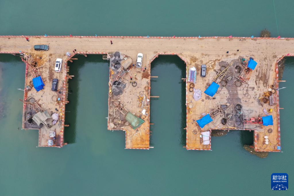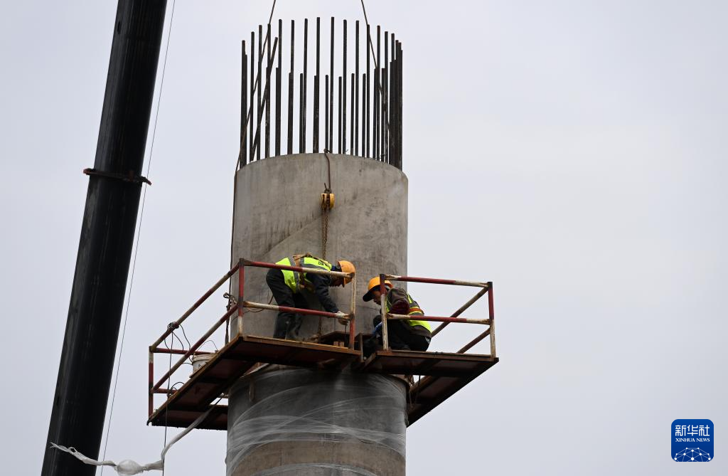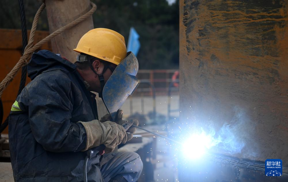 1月24日,在广西全州至灌阳高速公路湘江特大桥建设现场,中国能建葛洲坝一公司工人在施工。