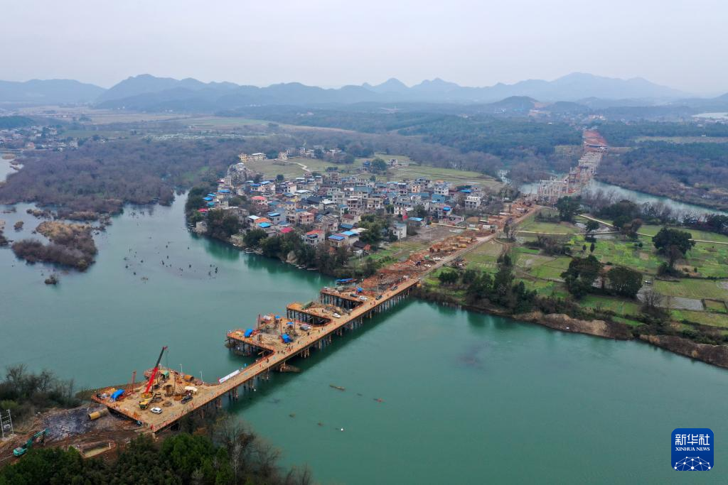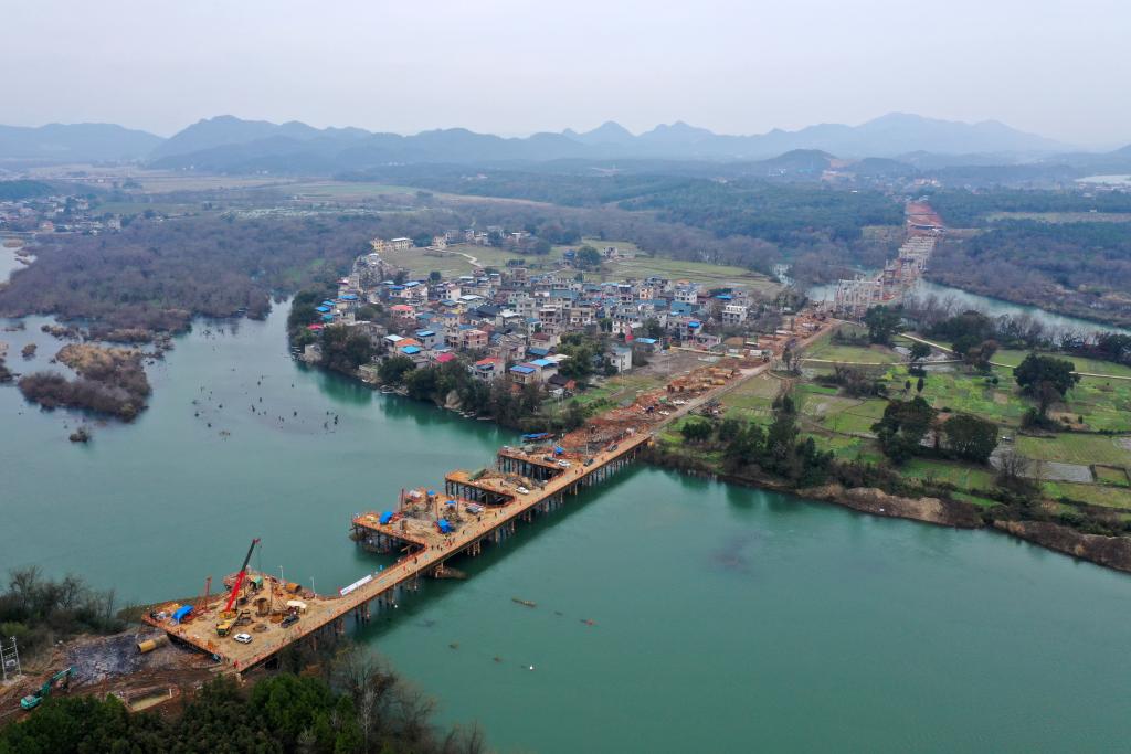 这是建设中的广西全州至灌阳高速公路湘江特大桥(1月24日摄,无人机照片)。