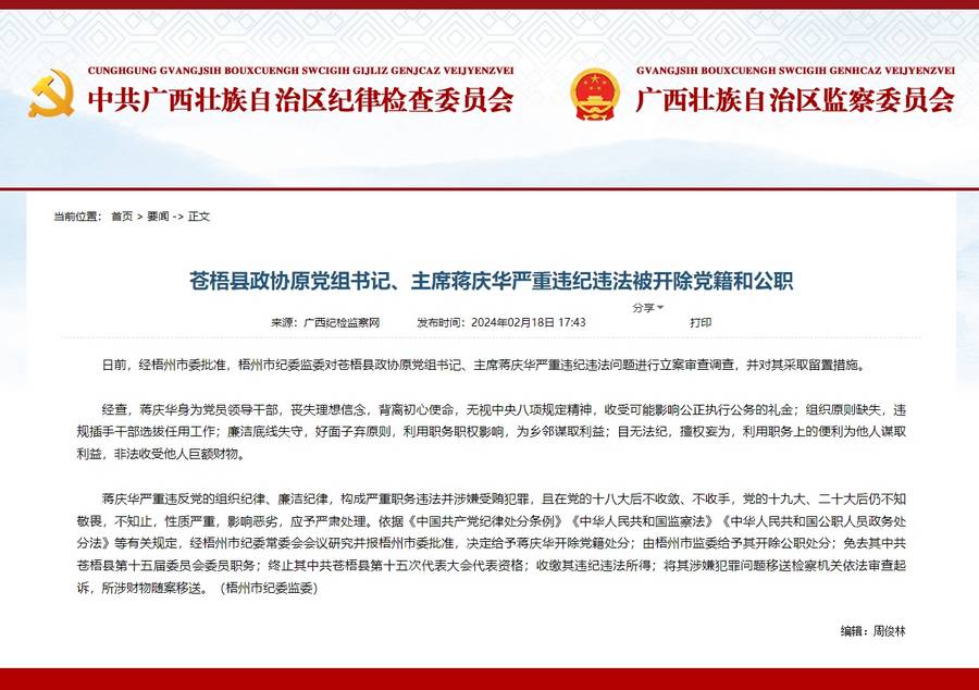 【原标题】苍梧县政协原党组书记、主席蒋庆华严重违纪违法被开除党籍和公职