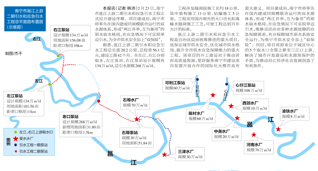 2月23日,南宁市邕江上游二期引水和应急引水工程正式拉开建设序幕。项目建成后,南宁市将率先在国内建成同规模联合运行的双水源体系,形成“两江并举,互为备用”的原水取水格局,在应急情况下可实现单边引水,为全市供水安全加上“双保险”。