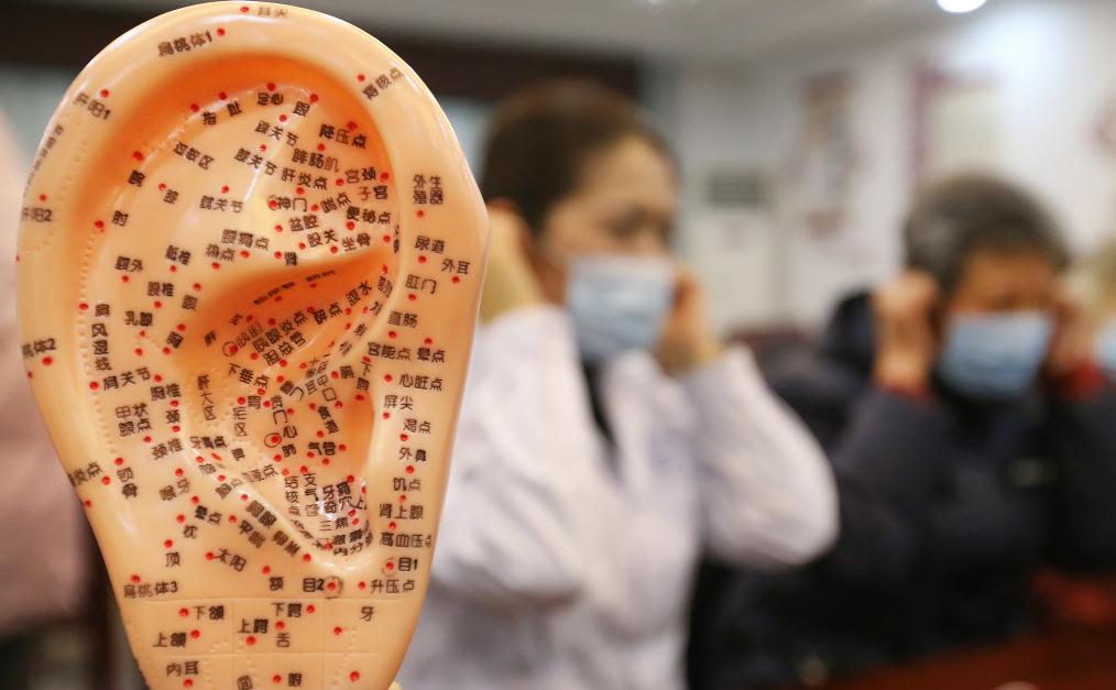 2022年3月2日,在江苏连云港市淀海社区,医务人员为居民讲解护耳知识。新华社发(王健民摄)