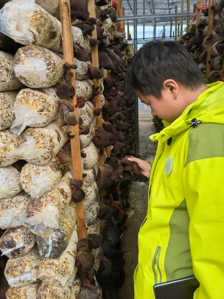 2月13日,在广西融水苗族自治县四荣乡移民安置点,学生利用假期到木耳种植基地体验采收木耳。(何海云 摄)
