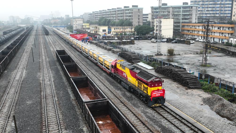 满载硫酸的罐式集装箱班列从广西防城港站开出(3月15日摄,无人机照片)。
