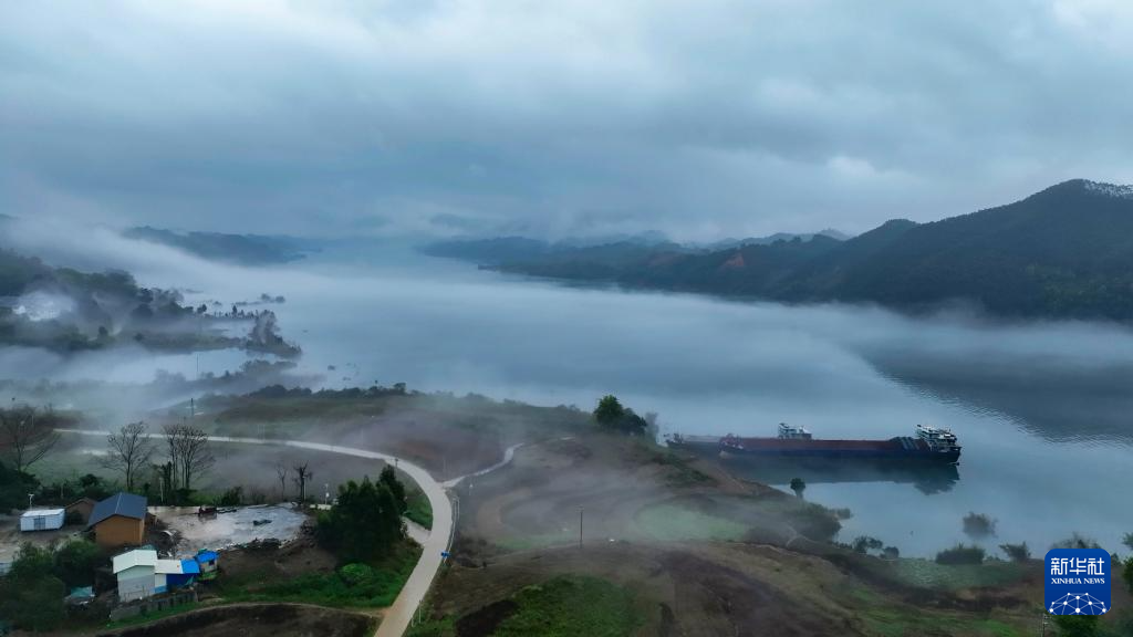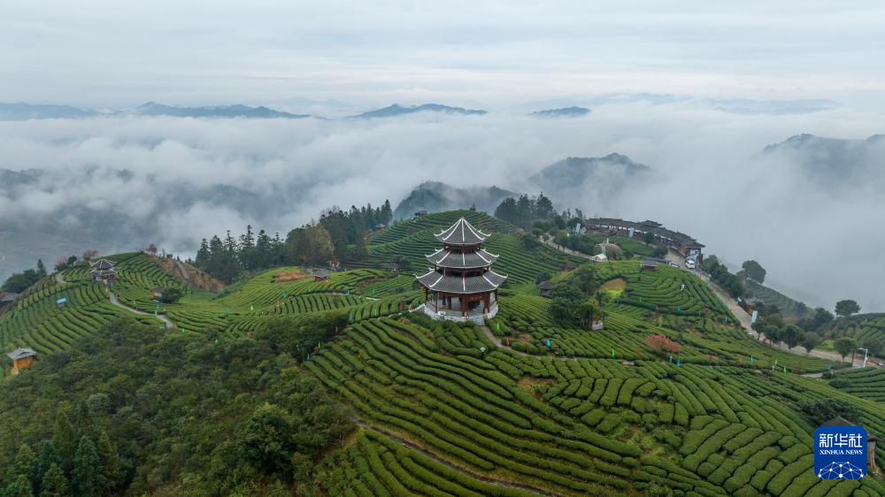 广西柳州市三江侗族自治县布央茶园里云雾缭绕,宛如仙境(3月14日摄,无人机照片)。