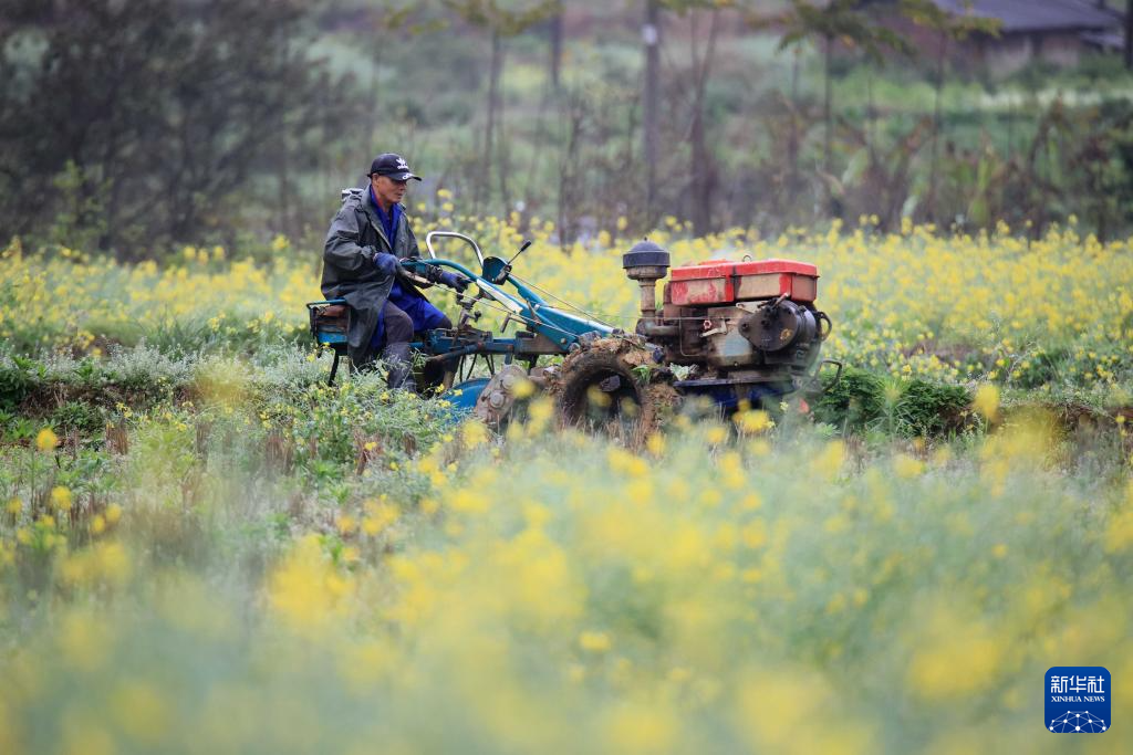 在广西柳州市融安县沙子乡三睦村,农民驾驶拖拉机耙田(3月18日摄)。