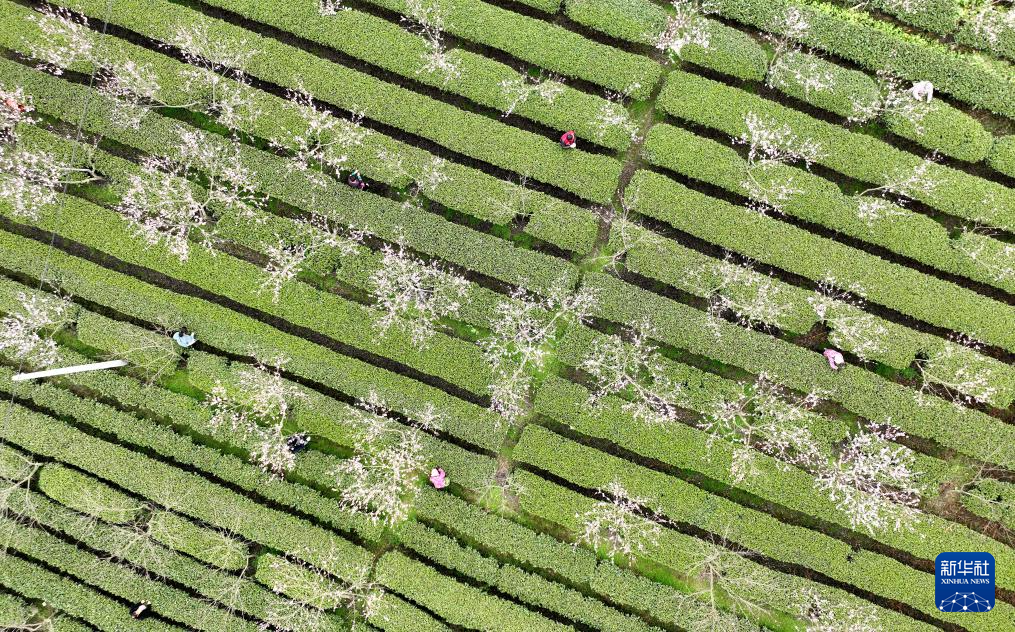 广西三江侗族自治县良口乡寨塘村茶农在茶园采摘春茶(3月20日摄,无人机照片)。