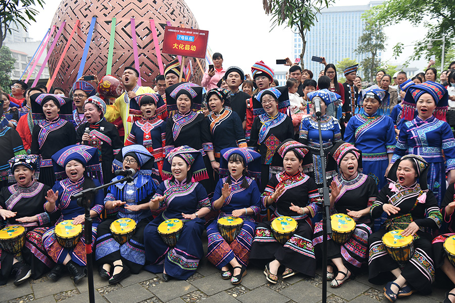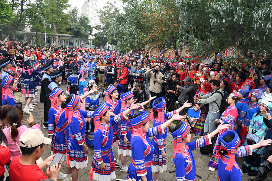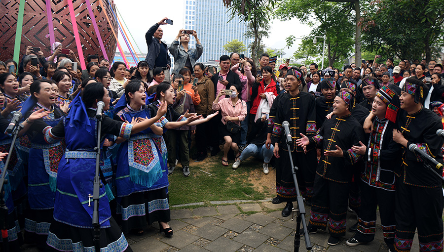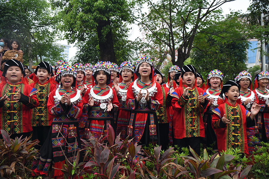 4月10日,广西大化瑶族自治县举行“三月三歌圩、山歌拉歌赛”,各中小学、幼儿园及社区群众通过组队拉歌表演,欢庆广西“三月三”。(韦哲)
