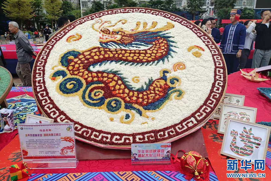 五色糯米饭作品“龙年剪纸映翠盘 潮起大化三月三”