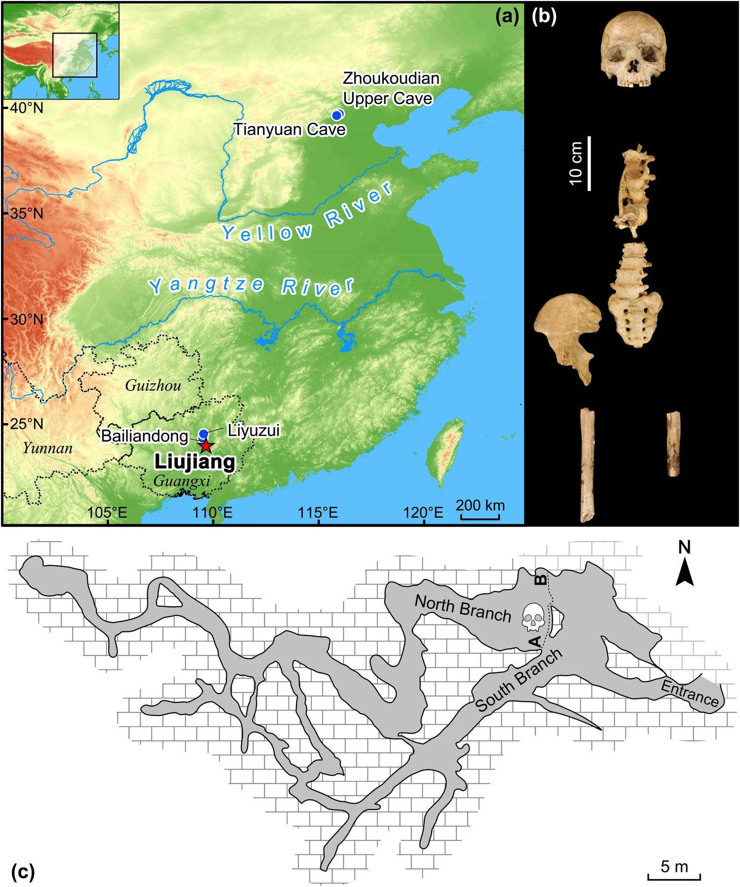 柳江人地理位置(a)、柳江人化石(b)、通天岩洞平面图(c)。(中国科学院古脊椎所供图)