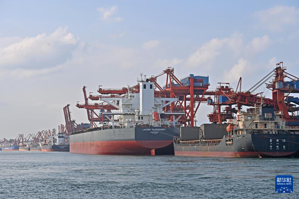 货轮在防城港码头卸货(5月21日摄,无人机照片)。