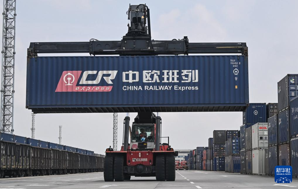 在钦州港码头货场,一辆吊车在集中堆放中欧班列集装箱(5月23日摄)。