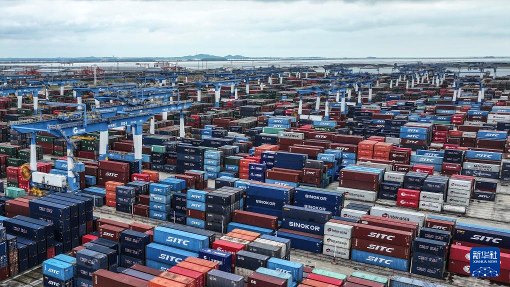 海轮停靠在钦州港集装箱装卸自动化码头卸货(5月20日摄,无人机照片)。