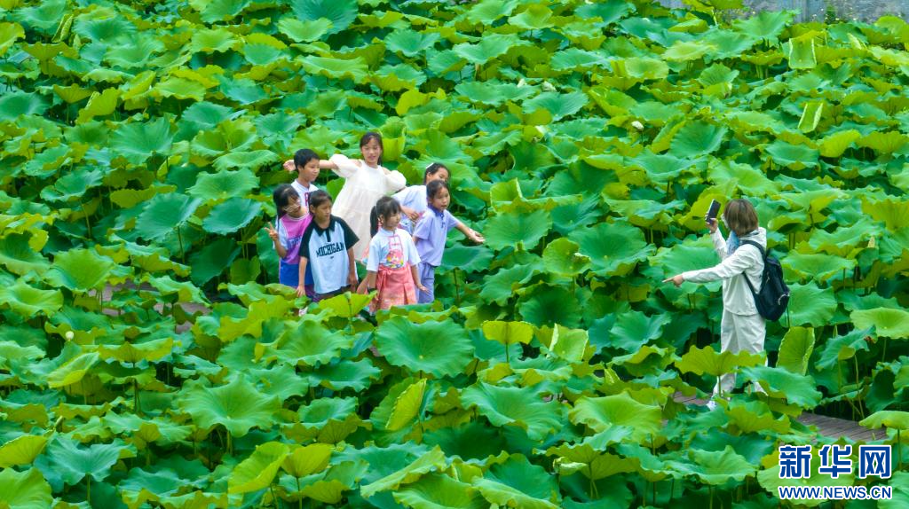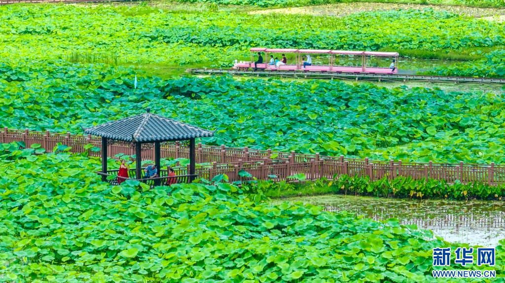 6月2日,游客在柳州市柳江区百朋镇万亩荷塘里游览(无人机照片)。
