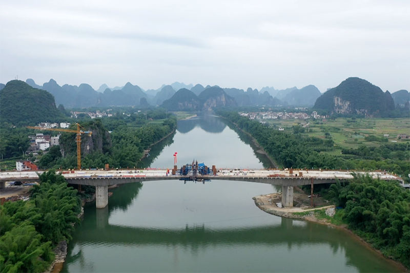 阳朔福利大桥是在兴安至阳朔公路延长线上的一座新建大桥,横跨于漓江之上,桥梁全长463米,此次合龙的主桥采用预应力混凝土变截面斜腹板连续刚构,主桥合龙段宽31米,长2米。