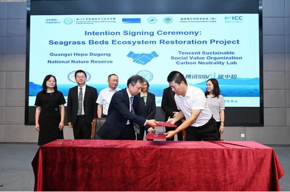 新华网南宁6月8日电 蓝碳意向认购签约仪式暨“蓝色经济与碳中和对海洋可持续性的协同作用”高峰座谈会6月7日在厦门大学举办。其间,腾讯碳中和实验室和广西壮族自治区合浦儒艮国家级自然保护区举行了海草床生态修复项目蓝碳生态系统碳汇意向认购签约仪式。