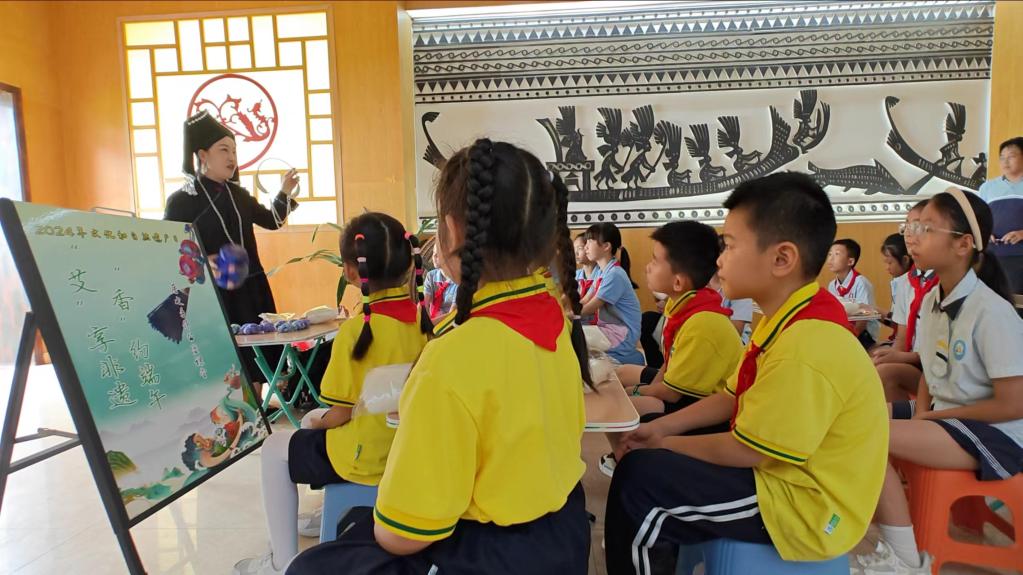 新华社南宁6月9日电(记者李欢、黄凯莹)正值端午假期,广西百色市博物馆内,艾叶、菖蒲等草药味沁人心脾。在一场麽乜香囊制作活动中,右江壮族麽乜制作技艺代表性传承人姚美娟正在给小朋友们讲述麽乜的故事、科普麽乜的制作工艺。