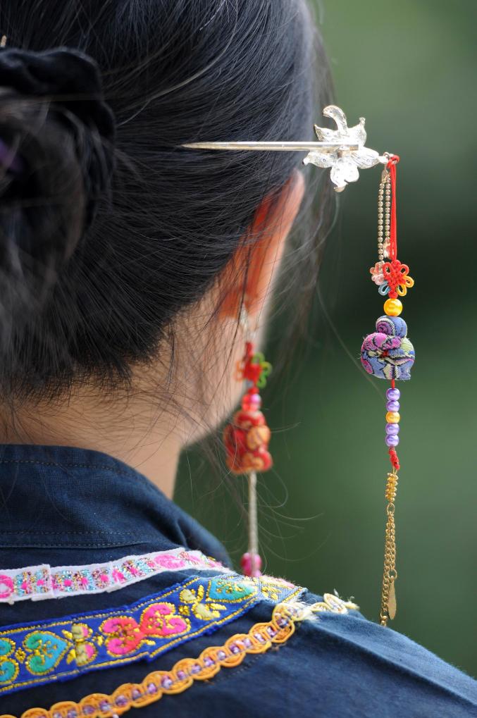 一名广西百色市右江区壮族妇女头上佩戴“麽乜”耳环和发簪。新华社发(韦万忠 摄)